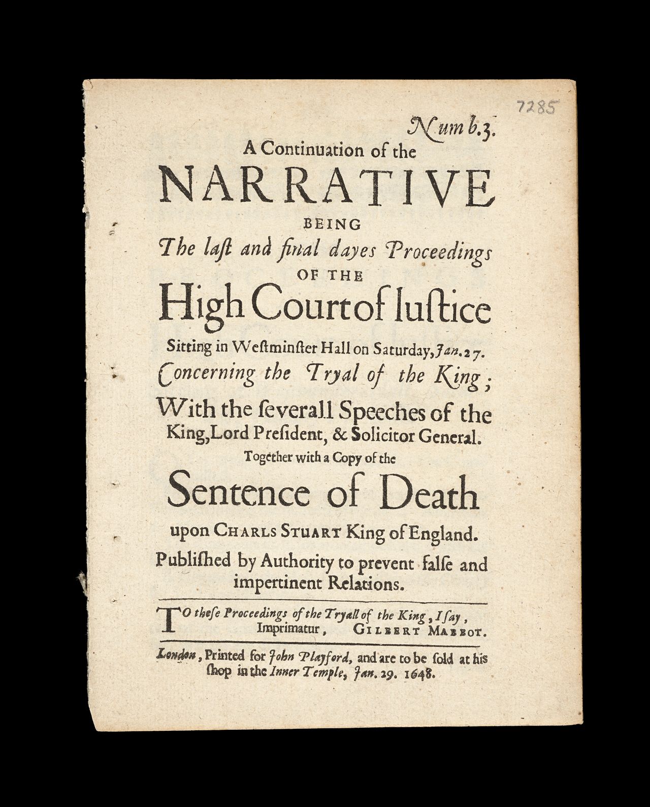 'A continuation of the Narrative being The last and final daues Proceedsings of the High Court of Justice Sitting in Westminster on Saturday, Jan. 27, Concerning the Tryal of the King…. Together with a copy of the Sentence of Death….' 1649, printed for John Playford, and are to be sold at his shop in the Inner temple : London, State Library Victoria, Melbourne (RAREEMM 134/22)