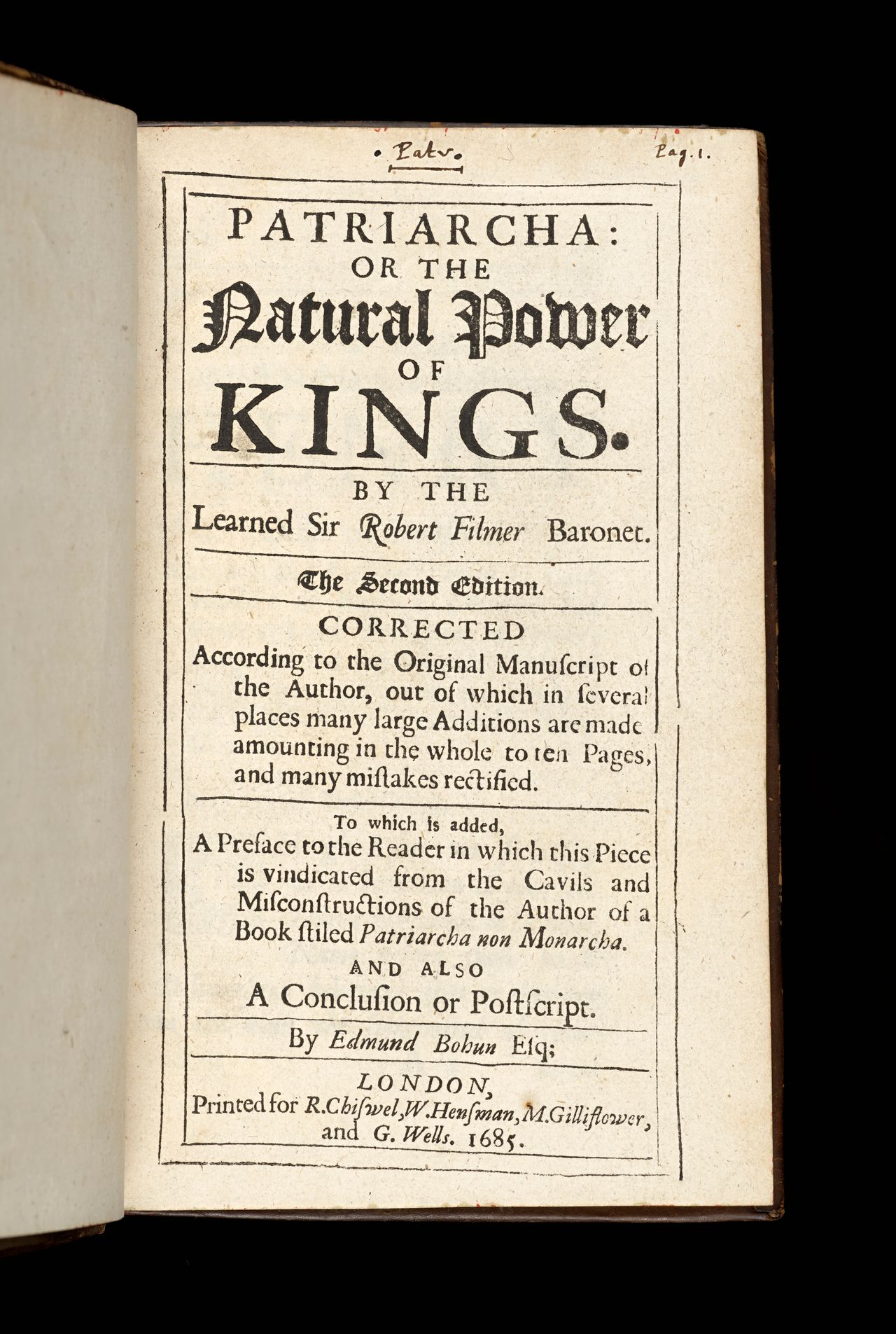 Robert Filmer, 'Patriarcha: or, the natural power of kings', London, printed for R. Chiswel, W. Hensman, M. Gilliflower, and G. Wells, 1685, State Library Victoria, Melbourne (RAREEMM 423/18)