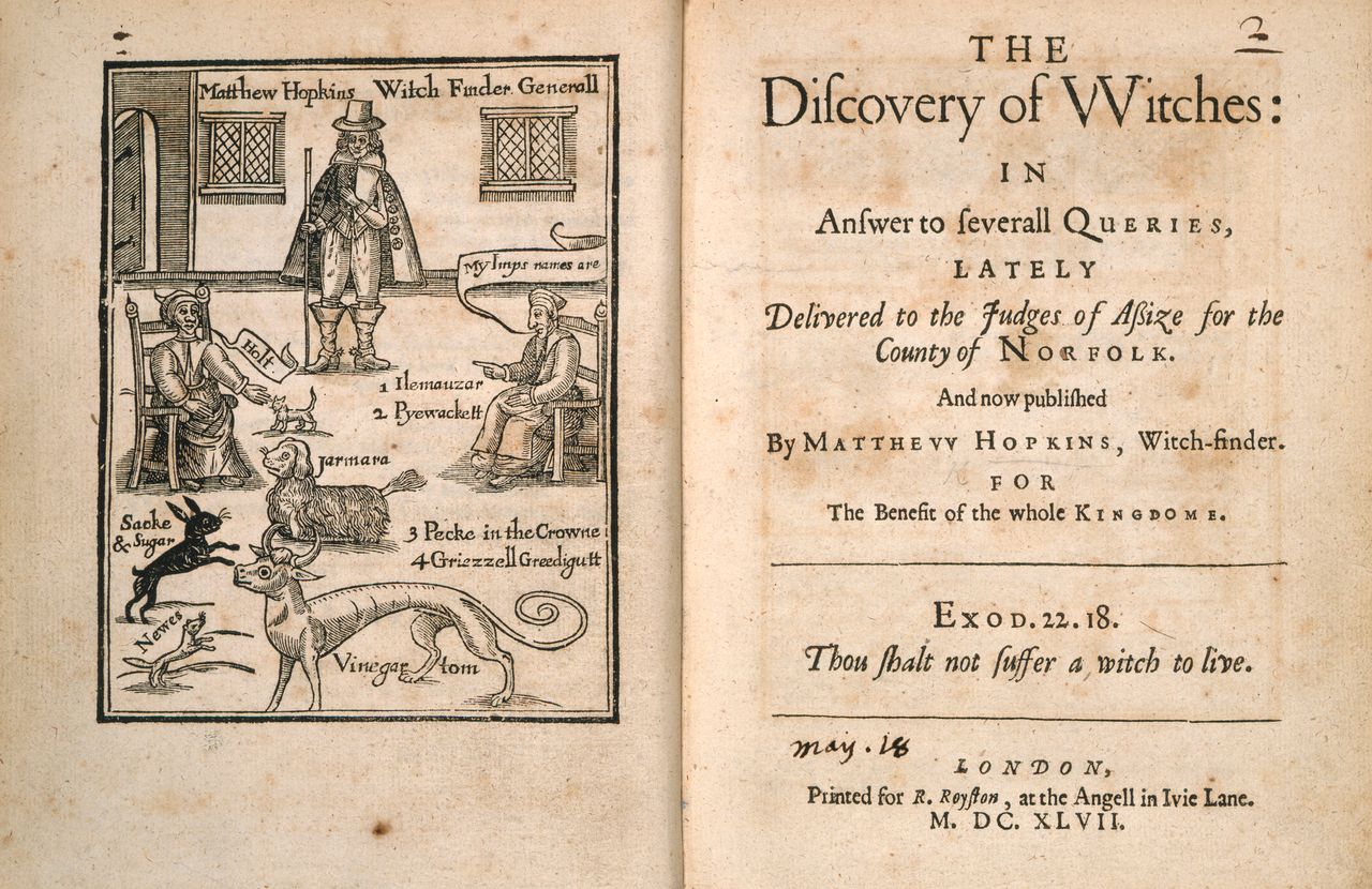 Woodcut of witches identifying their familiars from Matthew Hopkins, 'The Discovery of Witches', London, printed for R. Royston at the Angell in Ivie Lane, 1647, British Library, London (E.388.(2.))