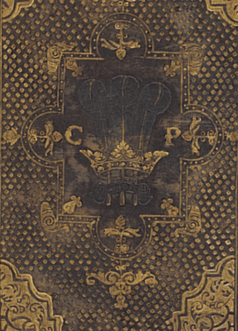 Stamped monogram on the cover of James Stuart, 'The workes of the most high and mighty prince, Iames by the grace of God, King of Great Britaine, France and Ireland.....' London, printed by Robert Barker and Iohn Bill, printers to the Kings most excellent Maiestie, 1616, State Library Victoria, Melbourne (RAREEMM 324/1)