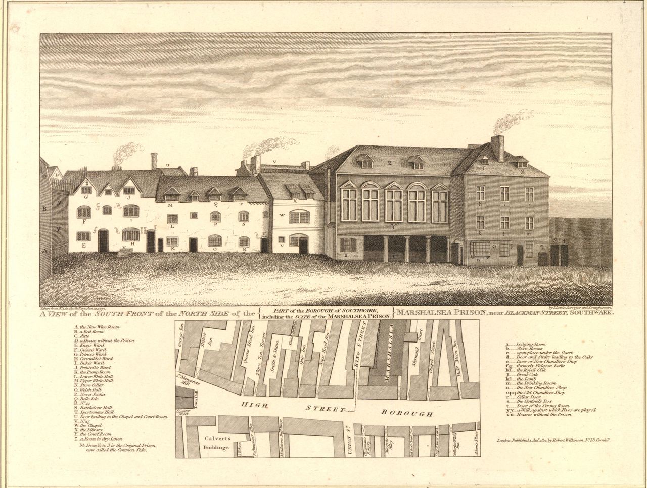 Anonymous artist (after James Lewis), 'A View of the South Front of the North Side of the Marshalsea Prison…', published by Robert Wilkinson, London, 1812, British Museum, London (1880,1113.5184)