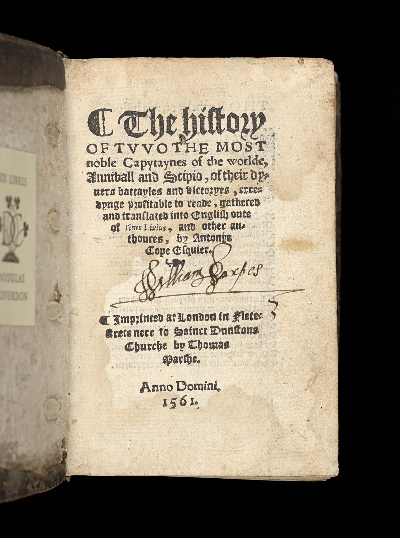 Signature of William Saxpes in Livy and others, 'The history of tvvo the most noble capytaynes of the worlde, Anniball and Scipio, of their dyuers battayles and victoryes', translated by by Antonye Cope, London, in Fletestrete nere to Sainct Dunstons Churche by Thomas Marshe, 1561, State Library Victoria, Melbourne (RAREEMM 114/1)