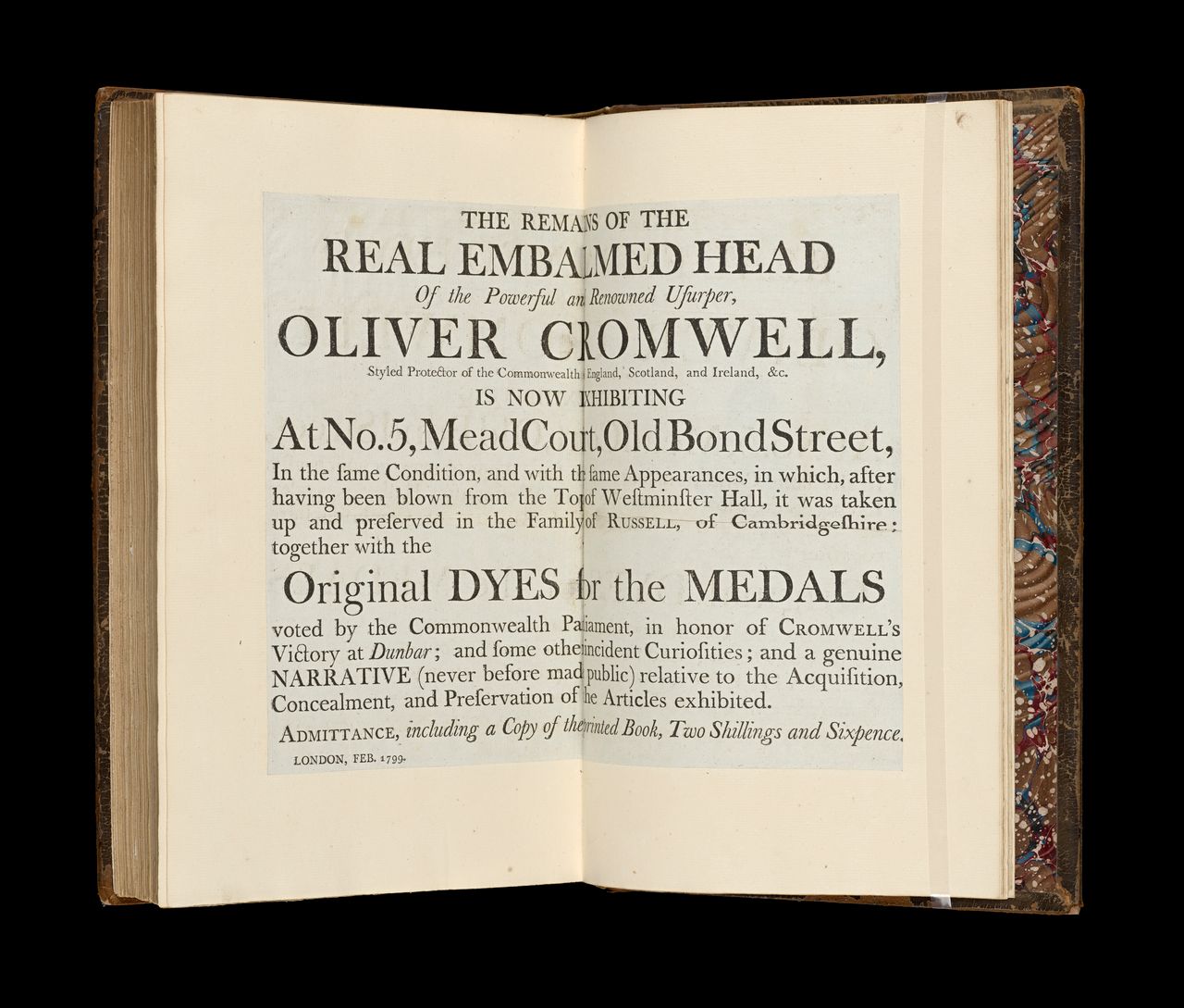 'The Remains of the real embalmed head of the powerful and renowned usurper Oliver Cromwell, styled protector of the Commonwealth of England, Scotland, and Ireland, &c. is now exhibiting at no. 5 Mead Court, Old Bond Street... , London, 1799, in an extra-illustrated copy of Cromwelliana: a chronological detail of events in which Oliver Cromwell was engaged …', London, 1810, State Library Victoria, Melbourne (RAREEMM 2016/15)